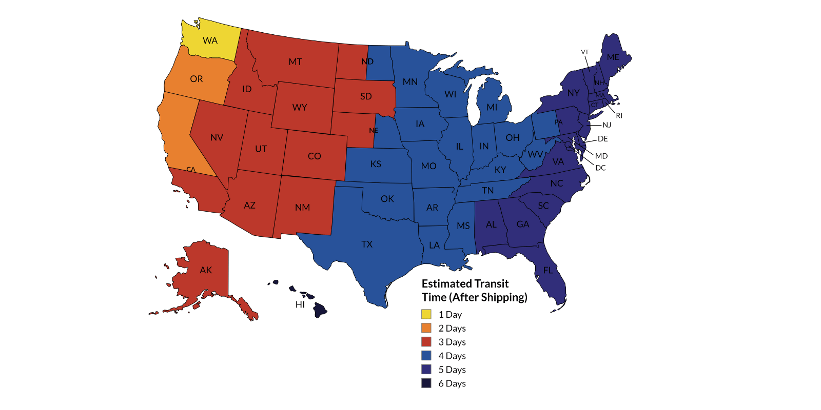 Shipping times can vary depending on the product. For standard items sent via FedEx please refer to the map below for approximated shipping times. If your item is oversized or overweight, we may ship it by truck.